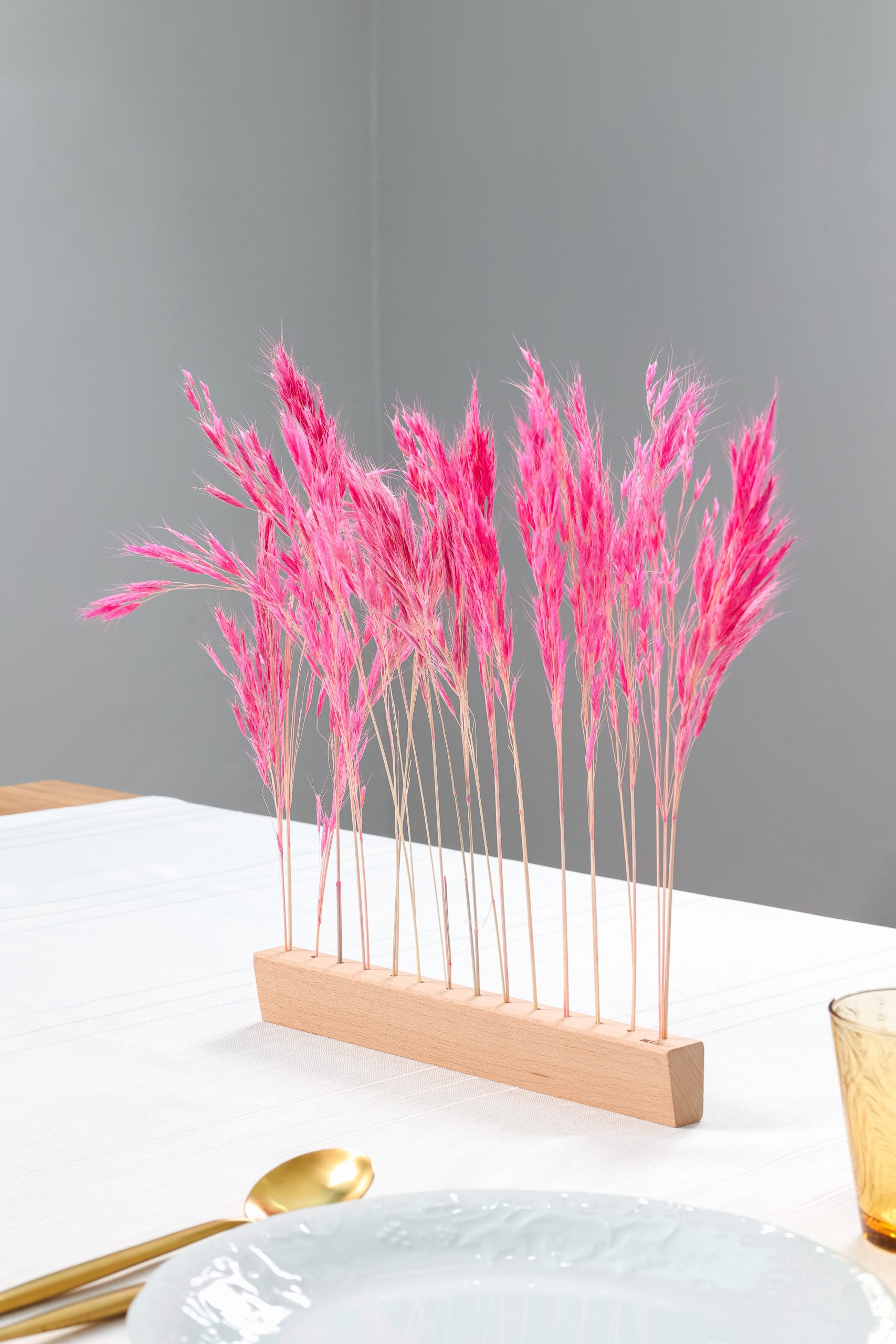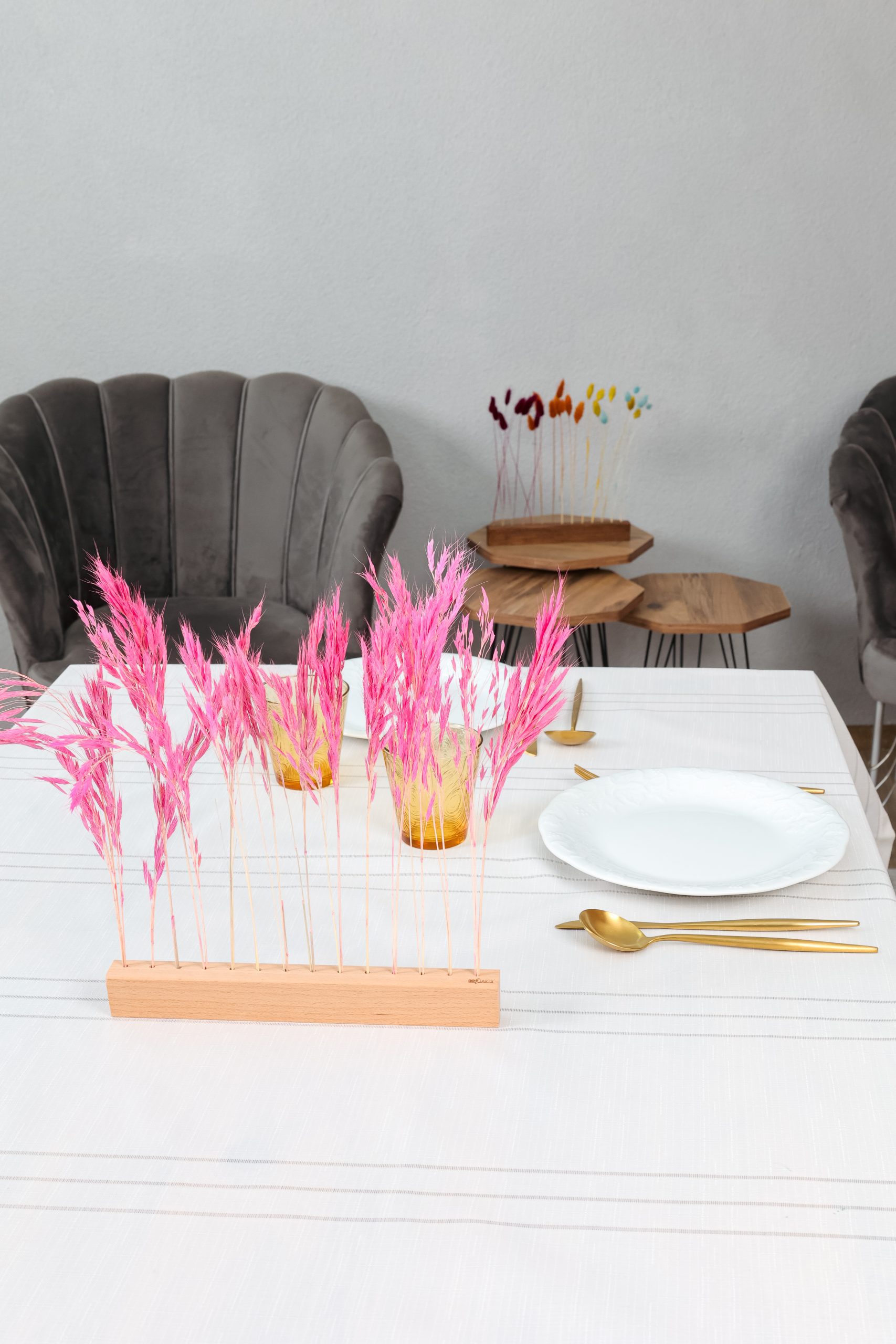 Bu sade ama etkileyici masa dekoru, pembe kurutulmuş çiçekleri ve doğal ahşap tabanıyla mekanlarınıza canlılık katar. Minimalist tasarımı sayesinde sofralarınızda modern ve ferah bir atmosfer yaratır. Hem günlük kullanımda hem de özel davetlerde masa düzenini tamamlayan bu ürün, dekorasyon tutkunlarının favorisi olacak.